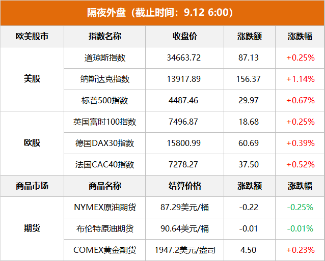 美股:标普500指数收涨29.97点,涨幅0.67%,报4487.46点。道指收涨87.13点,涨幅0.25%,报34663.72点。纳指收涨156.37点,涨幅1.14%,报13917.89点。