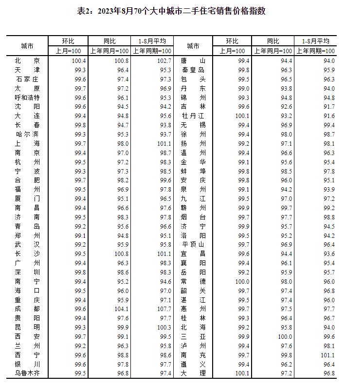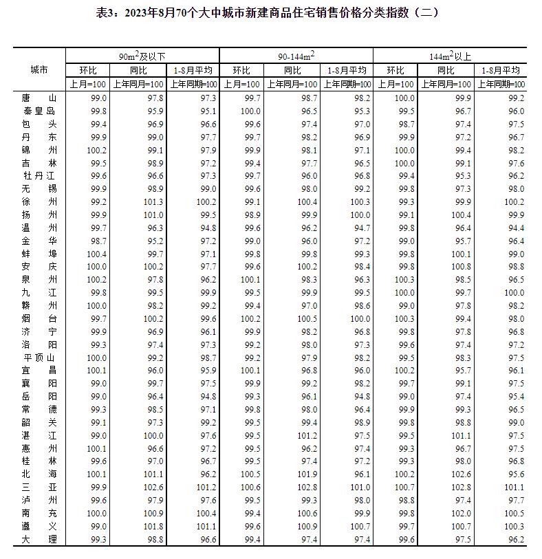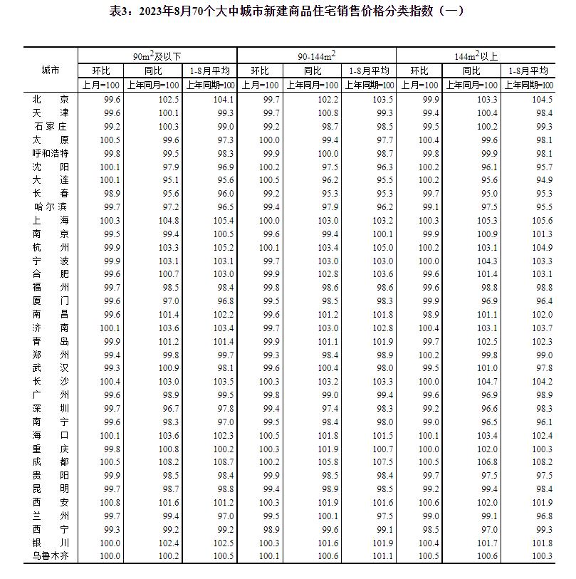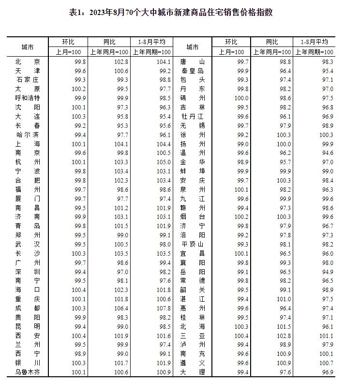 2023年8月份70个大中城市商品住宅销售价格变动情况