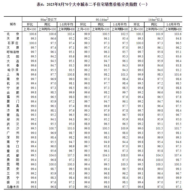 8月份,一线城市新建商品住宅销售价格同比上涨0.6%,涨幅比上月回落0.4个百分点;二线城市新建商品住宅销售价格同比上涨0.3%,涨幅比上月扩大0.1个百分点;三线城市新建商品住宅销售价格同比下降1.4%,降幅比上月收窄0.1个百分点。8月份,一、二线城市二手住宅销售价格同比分别下降1.6%和3.0%,降幅比上月分别扩大0.2和0.3个百分点;三线城市二手住宅销售价格同比下降3.5%,降幅与上月相同。