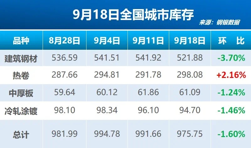 钢银电商18日公布数据显示,截至9月18日的一周,全国39个城市,共计149个仓库的城市钢材总库存量为975.75万吨,较同口径上周环比减少15.91万吨,降幅1.60%。