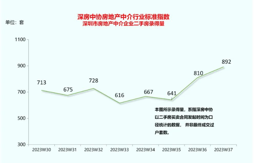 更能反映市场的二手房市场也持续回温。根据深圳市房地产中介协会数据,上周( 2023.9.11-2023.9.17),深圳二手房(含自助)录得交易量892套,环比增长10.1%,二手房录得量持续回升。