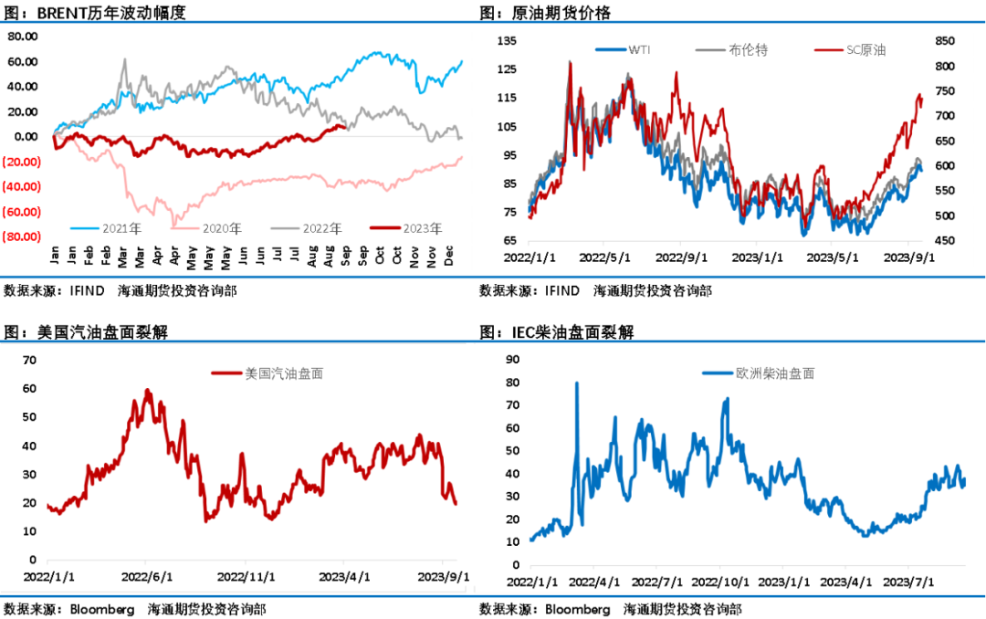 沙特、俄罗斯减少供应延长到年底的利多逐渐被市场计价之后,俄罗斯宣布于9月21日开始临时限制柴油和汽油出口以稳定国内市场。这增加了市场的担忧情绪,作为全球主要的柴油出口国之一,俄罗斯对汽柴油的临时出口禁令对于柴油市场影响较大,消息公布后欧美柴油期货一度涨近5%,此举也提振了原油价格。根据睿咨得评估最新的全球原油供需情况预测,2023年第四季度市场供应将更为紧张,将2023年第四季度全球原油供应比需求短缺60万桶/日调整到了130万桶/日,而此次俄罗斯暂停成品油出口之后,虽然没有明确的临时禁令时间表,但还是会加剧石油市场供应吃紧的局面并进一步导致全球油品贸易格局出现动荡。油价持续攀升让自愿减产的沙特、俄罗斯石油出口收入得到了补偿,国际能源署称俄罗斯石油出口收入在8月上升到10个月来的最高水平,因为较高的价格抵消了该国较低的出货量。俄罗斯上月从对海外供应的原油和石油产品中获得了171亿美元的收入,比7月份多18亿美元。这也比今年的月平均水平高出约26亿美元。另外有数据显示沙特阿拉伯石油收入的下滑可能也已经结束,此前沙特的石油出口收入在7月份下降至187亿美元,这是自2021年9月以来最低的数字,但8月和本月可能有显著改善。