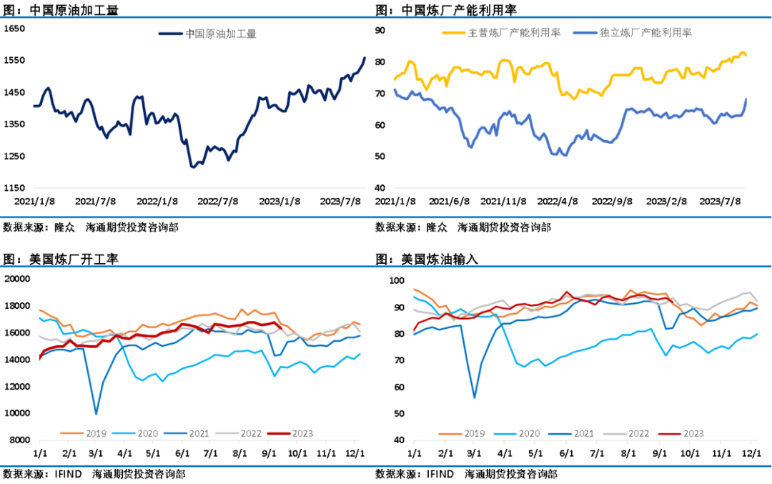 最新周度数据显示中国炼油加工量继续刷新历史记录,独立炼厂开工率的增加明显,中国今年恢复了成品油出口规模,近期海外市场价格明显高于国内成品油价格,更高的利润也增加了中国炼厂出口的动力。而随着出行旺季结束,美国原油加工量则进入季节性回落阶段。最新一期的EIA数据显示美国油品全口径库存维持了去库表现,四季度石油市场供应短缺将继续推动去库进程,低库存成为油价强势的底气。