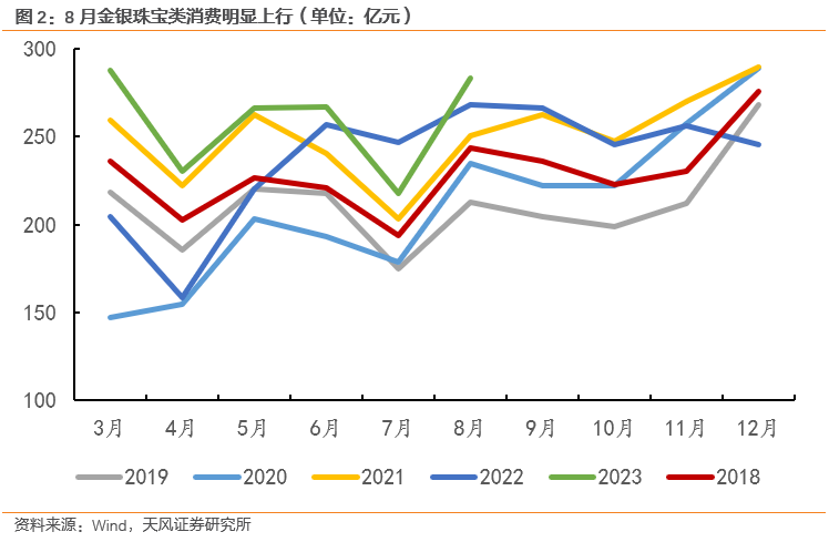 除机构投资需求提高外,随着十一假期临近、金价上涨等因素,居民消费购金的需求也在稳步上行,8月金银珠宝类零售总额的为283亿元,环比上涨29.8%,超过了过去5年均值7.8个百分点。