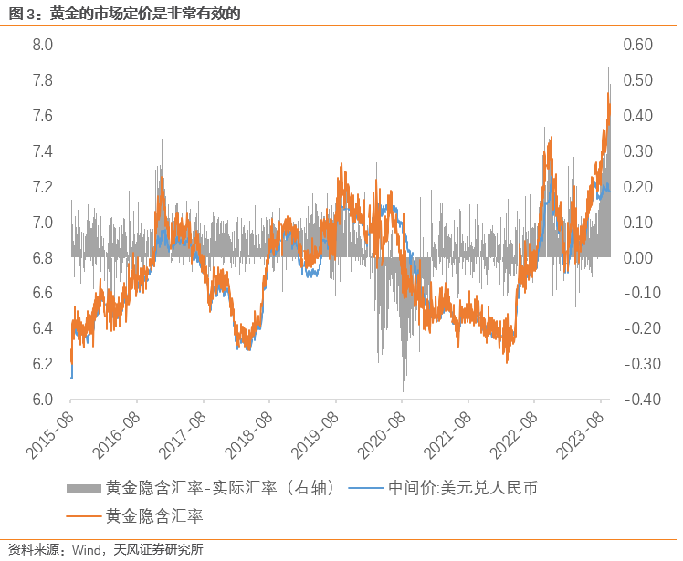 但根据中国人民银行和海关总署颁布的《黄金及黄金制品进出口管理办法》第三条,进口黄金需提供央行签发的《中国人民银行黄金及黄金制品进出口准许证》,换言之黄金进口受到管制。在人民币快速贬值,汇率接近箱体运行上限时,央行可能会控制黄金的进口配额,避免资金借道黄金流出,加剧贬值压力。因此内外金价溢价无法弥合,体现为隐含汇率与实际汇率的持续偏离。