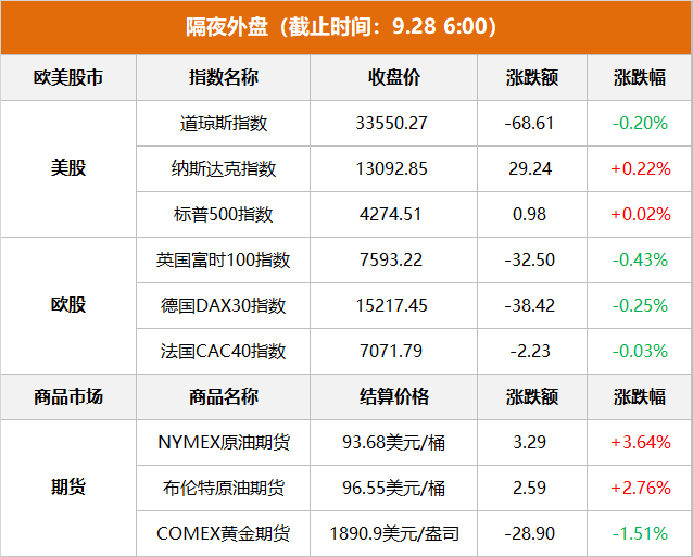 国际原油:WTI 11月原油期货收涨3.29美元,涨幅3.64%,报93.68美元/桶。布伦特11月原油期货收涨2.59美元,涨幅2.76%,报96.55美元/桶。