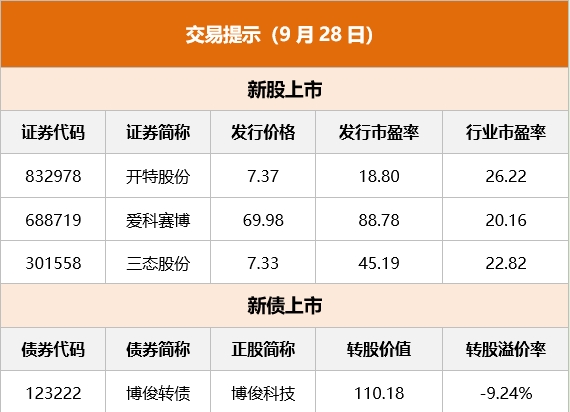 2、央行:中国人民银行货币政策委员会2023年第三季度(总第102次)例会于9月25日在北京召开。会议要点包括加大宏观政策调控力度,精准有力实施稳健的货币政策;推动企业融资和居民信贷成本稳中有降;坚决对单边、顺周期行为予以纠偏,坚决防范汇率超调风险;支持刚性和改善性住房需求,推动降低存量首套房贷利率落地见效;落实促进平台经济健康发展的金融政策措施,推动平台企业规范健康持续发展。