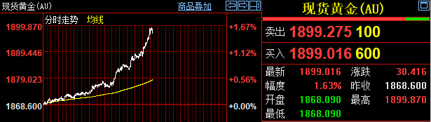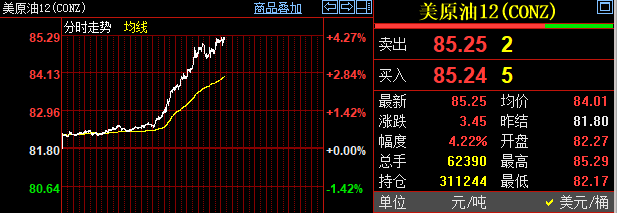 截至发稿,美原油大涨超4%,重新站上85美元;现货黄金涨超1.6%,逼近1900美元关口。