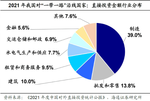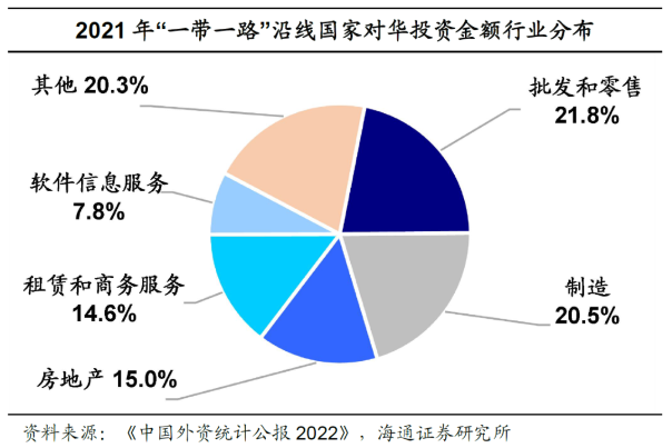 在推动我国企业“走出去”的同时,“一带一路”倡议对我国外资引入形成支撑。根据《中国外资统计公报2022》,2021年我国新设外商投资企业4.76万家,实际投资金额1809.6亿美元,其中来自“一带一路”沿线国家的占比分别为11.1%、6%。分行业看,批发零售业的新设企业数目、投资金额的占比分别达到47.5%、21.8%,领先于其他行业。制造业、房地产业虽然外资企业数目较少,但是投资金额占比相对较高,分别达到20.5%、15%。