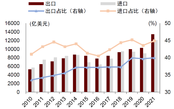根据商务部数据,2013年到2022年,我国与“一带一路”沿线国家货物的贸易额从1.04万亿美元扩大到2.07万亿美元,年均增长7.96%。进一步看,2022年我国对“一带一路”沿线国家的出口和进口总额分别为1.18万亿美元和8913.2亿美元,较2013年分别增加107.5%和89.1%。至2022年,我国对沿线国家的贸易额占总体的比重由2013年25%升至32.9%,对整体增速的拉动较为明显。