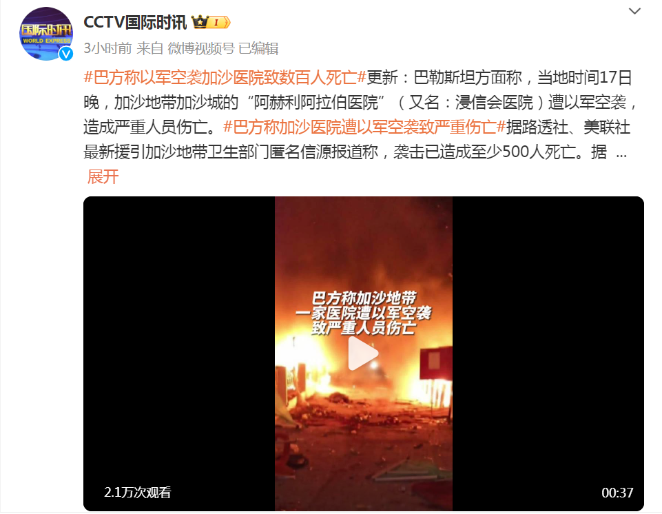 此前,巴勒斯坦方面称,当地时间17日晚,加沙地带加沙城的浸信会医院遭以军空袭,造成严重人员伤亡。