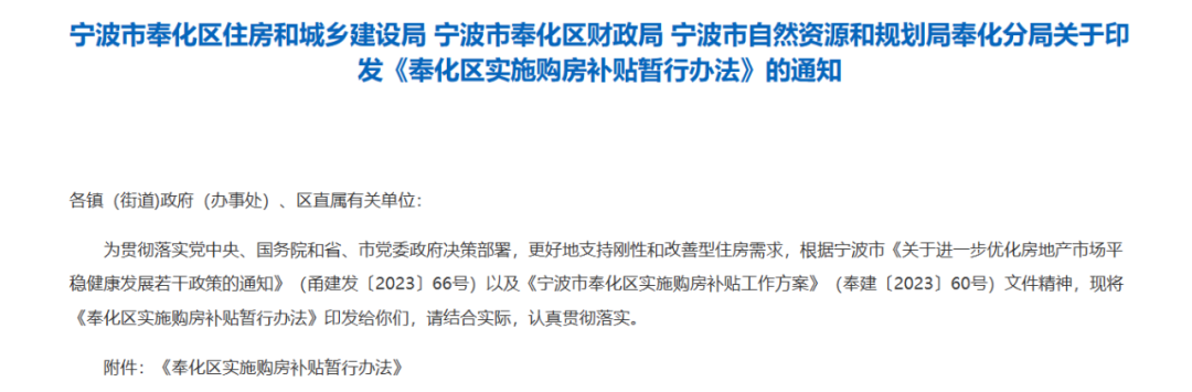 10月16日,浙江宁波市奉化区也提出实施购房补贴政策,购买新房的,一次性给予购房合同价款1%的货币补贴,但最高不超过4万元;购买二手房的,一次性给予完税价格1%的货币补贴,但最高不超过2万元。购房补贴实施时间自2023年10月1日起至2024年6月30日止。
