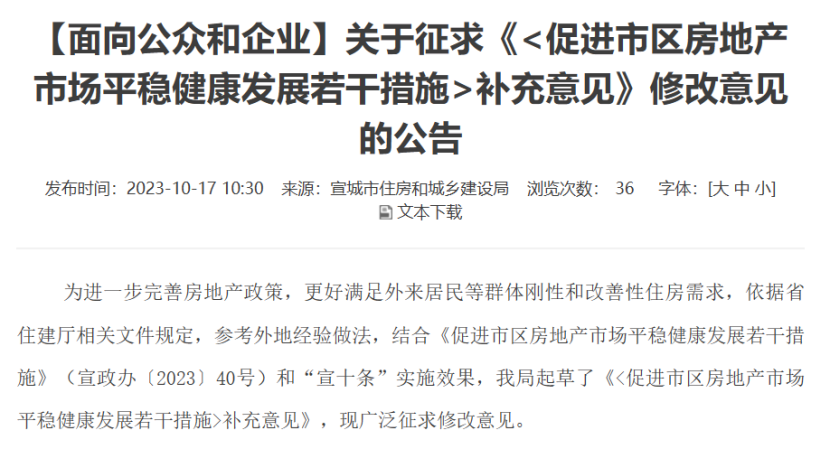 10月17日,宣城住建局就《<促进市区房地产市场平稳健康发展若干措施>补充意见》向公众征求修改意见。