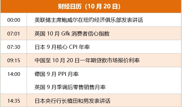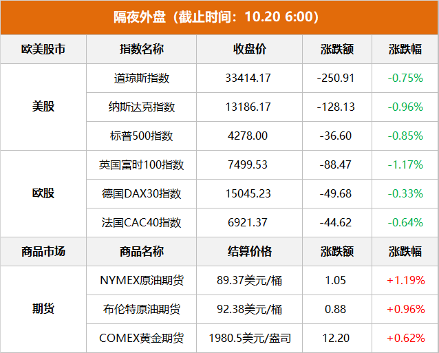 美债:周四(10月19)纽约尾盘,美国10年期基准国债收益率涨7.07个基点,报4.9855%。两年期美债收益率下跌7.64个基点,刷新日低至5.15%。20年期美债收益率涨11.24个基点,报5.3469%;30年期美债收益率涨12.09个基点,报5.1157%。三年期美债收益率跌4.85个基点,五年期美债收益率涨2.01个基点,七年期美债收益率涨5.45个基点。三个月期国库券/10年期美债收益率利差涨8.670个基点,报-49.910个基点。02/10年期美债收益率利差涨13.897个基点,报-16.869个基点。美国10年期通胀保值国债(TIPS)收益率涨1.76个基点,报2.4945%。