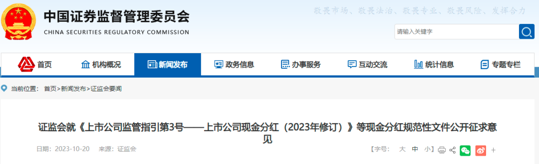 据证监会10月20日消息,为进一步健全上市公司常态化分红机制,提高投资者回报水平,中国证监会结合监管实践,对《上市公司监管指引第3号——上市公司现金分红》(以下简称《现金分红指引》),以及《上市公司章程指引》(以下简称《章程指引》)现金分红相关条款进行了修订,现向社会公开征求意见。