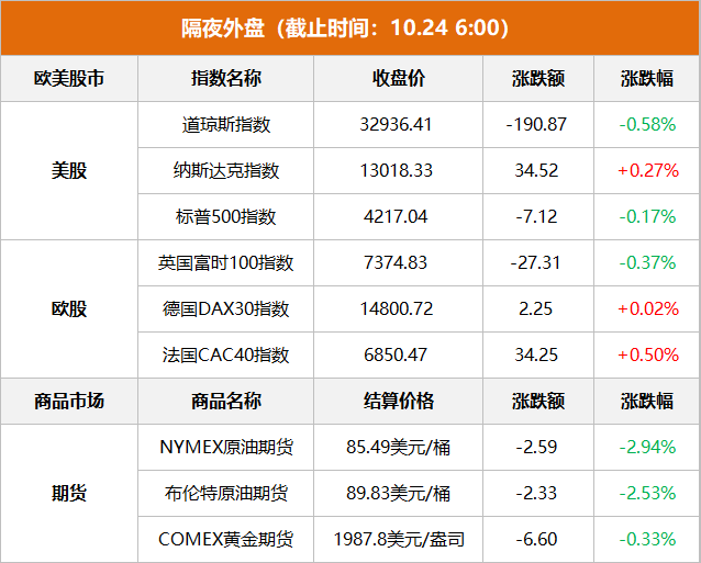 美债:周一(10月23日)纽约尾盘,美国10年期基准国债收益率下跌6.13个基点,报4.8523%,盘中交投于5.0187%-4.8270%区间。两年期美债收益率收平,报5.0731%,盘中交投于5.1311%-5.0581%区间。三个月期国库券/10年期美债收益率利差跌5.791个基点,报-61.553个基点。 02/10年期美债收益率利差跌5.708个基点,报-22.081个基点。