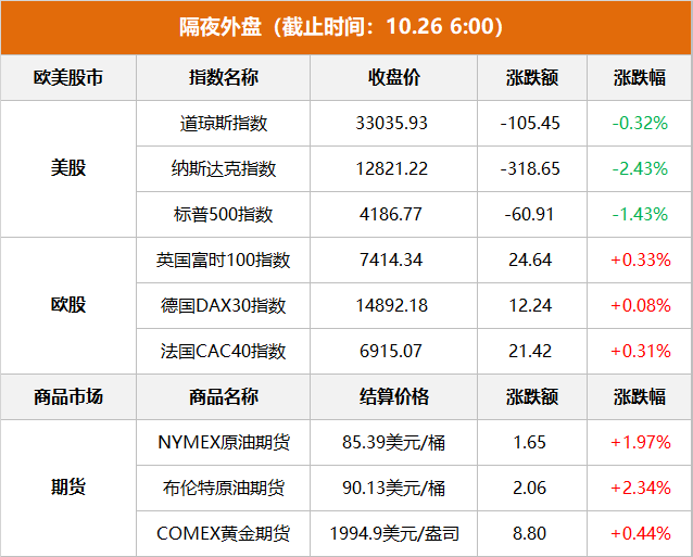 美股:标普500指数收跌60.91点,跌幅1.43%,报4186.77点。道指收跌105.45点,跌幅0.32%,报33035.93点。纳指收跌318.65点,跌幅2.43%,报12821.22点。