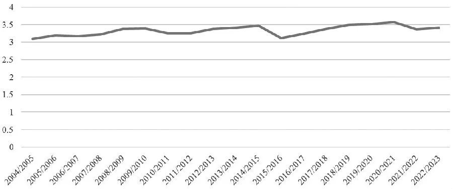 一般来说,决定棕榈油产量的因素是面积和单产。若无重大政策变化或外部冲击,油棕树种植面积是影响产量的中长期因素,而单产是短期因素,可以在短期内大幅波动,影响单产的因素众多,降雨量、树龄结构、劳动力数量、施肥情况、公共卫生事件等都会使单产波动。近20年来,印尼棕榈油单产总体表现平稳,在3.3吨/公顷上下波动,2022/2023年度的单产是3.41吨/公顷,在这个基础上,单产向上大幅波动的可能性较小。