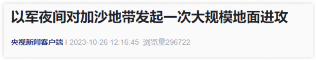10月26日午间,央视新闻援引以色列陆军广播电台当地时间10月26日早间报道,25日晚间至26日凌晨,以色列国防军对加沙地带发起一次大规模地面进攻。