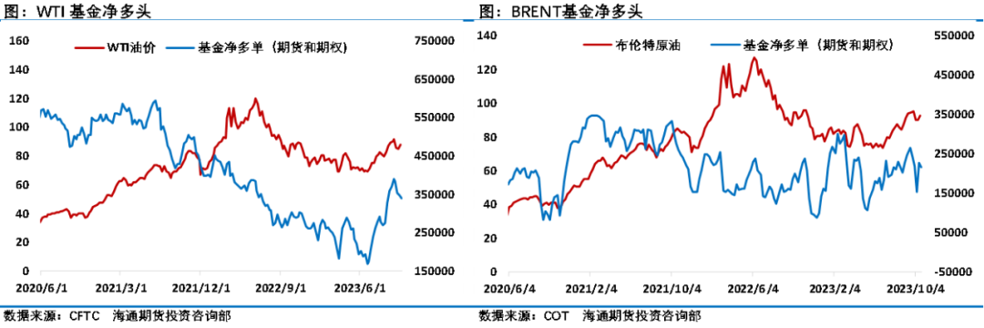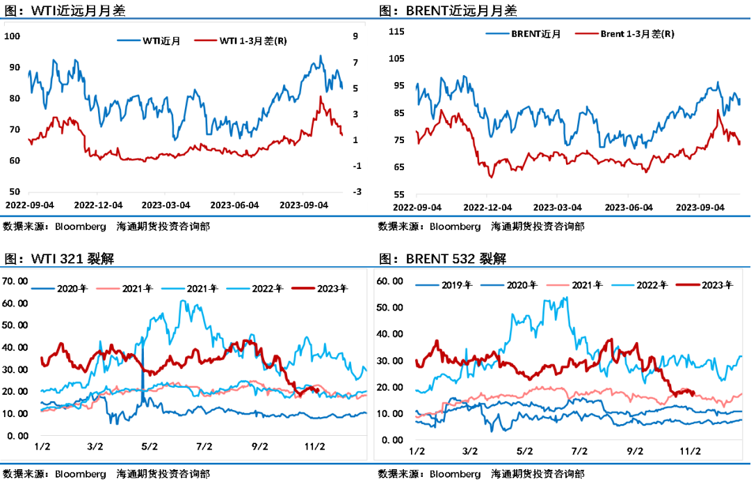 透过地缘因素迷雾,观察过去一段时间原油市场的表现,油价驱动正在从欧佩克+减产推动油价重心上移开始发生变化。典型的盘面指标显示,从9月份开始全球成品油裂解差持续走弱,油价10月初急跌阶段,成品油市场比原油表现的更弱,显然减产推动的高油价开始伤害到需求端。进入10月之后,原油市场月间差快速转弱,即便是全球原油库存降至5年底低点,库欣库存维持低位,巴以冲突带来供应的扰动均未能重新推动原油市场月间差保持强势,显然市场已经从三季度积极看涨油价转变为四季度预期更为谨慎。最新持仓数据显示,WTI、布伦特原油投机净多头寸均有所回落。CFTC最新数据显示,截至10月24日当周,WTI原油期货投机性净多头头寸减少3862手至179489手。而洲际交易所(ICE)布伦特原油期货投机性净多头头寸减少10766手合约至216696手合约。