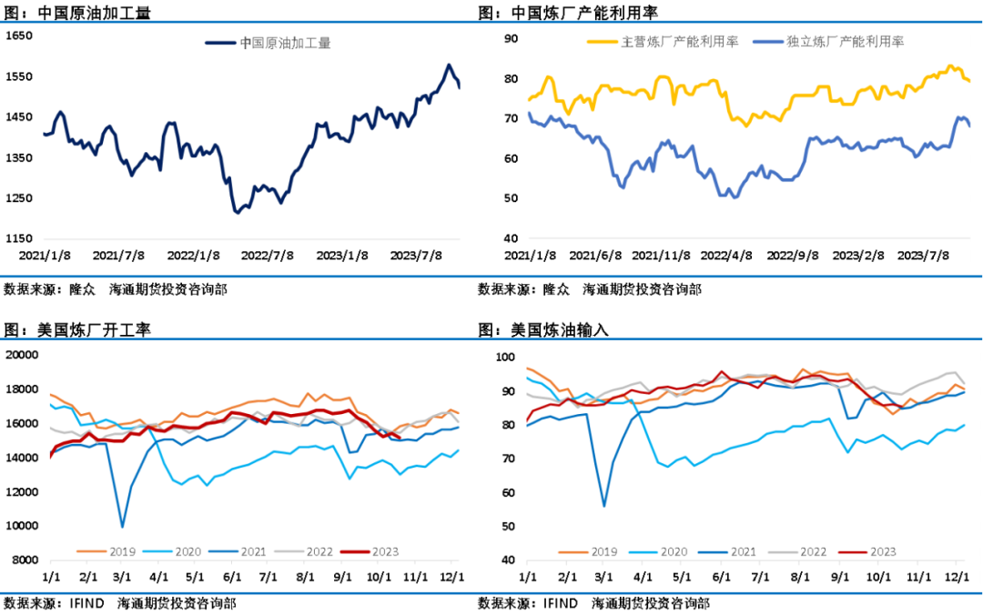 需求方面,现阶段已经进入全球需求淡季,高油价又进一步压制了需求端表现,中国原油加工量已经连续四周回落,成品油价格持续走弱,炼厂炼油利润持续收缩,国内炼油开工率回落明显。另外,周四商务部最新公告显示,2024年原油非国营贸易进口允许量为24300万吨,与2023年持平,这也是自2021年以来连续四年稳定在24300万吨。中国原油需求已经逐渐趋于接近峰值,在今年脱离疫情困扰经历了一个强势反弹之后,2024年之后中国市场需求增量将相对有限。美国需求同样亮点不多,美国至10月20日当周EIA车用汽油总产量引伸需求数据969.59万桶/日,前值1002.41万桶/日;原油产量引伸需求数据1901.7万桶/日,前值1978.4万桶/日。