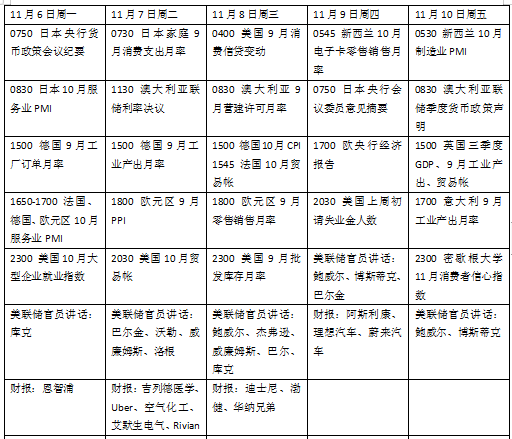 本周看点颇多,美联储主席鲍威尔再度亮相,外界将从最新美国消费信贷数据中寻找经济动能的变化信号;澳大利亚联储将公布利率决议,加息是潜在的选项;英国将公布三季度GDP数据,或强化央行结束紧缩的预期。美股财报季临近尾声,迪士尼、造车新势力理想、蔚来财报值得关注。