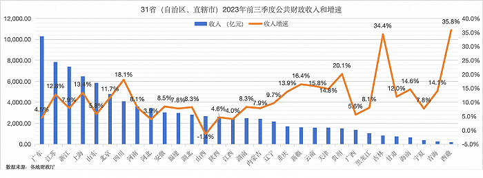 日前,全国31省(自治区、直辖市)均已公布了2023年前三季度财政收支情况,有15个省份一般公共预算收入同比增速跑赢了全国8.9%的水平,其中,6个省份上半年财政收入增速超过了15%。