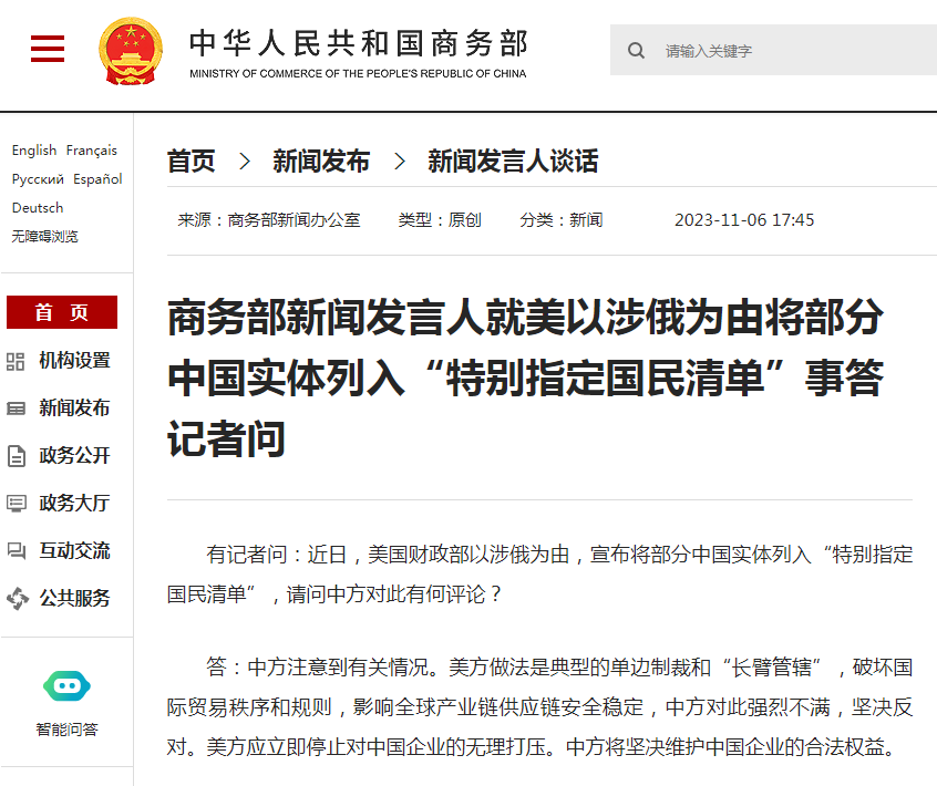 有记者问:近日,美国财政部以涉俄为由,宣布将部分中国实体列入“特别指定国民清单”,请问中方对此有何评论?