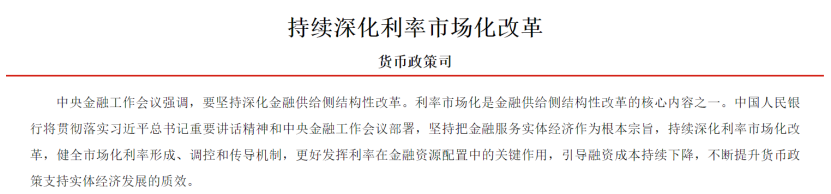 11月6日,人民银行货币政策司发布署名文章《持续深化利率市场化改革》,也是央行发布的第二篇“贯彻落实中央金融工作会议精神”系列解读文章。