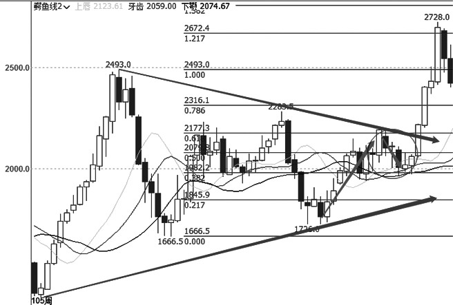 实际交易中,又体现了行情走势的自相似性。在图二的日线走势中,4浪也是一个区间整理的三角形形态,后市5浪冲高。同样,周线级别的走势图上也清晰地显示出区间振荡及大双底特征,这就是价格走势结构的自相似性。运用这种自相似性,在小级别周期中发现交易机会,就能跟踪出大级别趋势,也就是小行情产生大行情,反过来大行情决定小行情,且大行情一旦形成不会轻易改变。