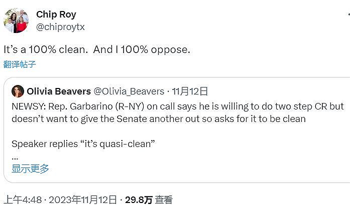 但该方案立刻遭到了共和党极右翼的反对。德州众议员、众议院规则委员会成员罗伊(Chip Roy)率先发声,指责该计划完全没有体现保守派的诉求:大幅削减政府开支。