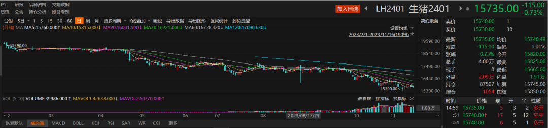 期货方面,国内生猪期货2401主力合约收盘报价为15735元/吨,较前一日每吨下跌115元,跌幅达0.73%。
