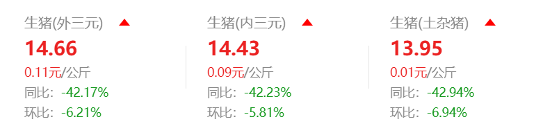 11月16日,根据中国养猪网数据,全国生猪(外三元)价格为14.66元/公斤,同比下滑42.17%,环比下跌6.21%;全国生猪(内三元)价格为14.43元/公斤,同比下滑42.23%,环比下跌5.81%;全国生猪(土杂猪)价格为13.95元/公斤,同比下滑42.94%,环比下跌6.94%。