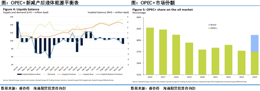 此次会议结果显示欧佩克+成员国们各自宣布在明年一季度期间“自愿”减产,总规模合计219.3万桶/日,其中沙特每天减产100万桶,其余国家的具体减产规模为:伊拉克减22万桶/日、阿联酋减16.3万桶/日、科威特减13.5万桶/日、哈萨克斯坦减8.2万桶/日、阿尔及利亚减5.1万桶/日和阿曼减4.2万桶/日,这一减产规模基本与去年4月份各国承担的减产任务相当。这样欧佩克+集团每天减少170万桶石油产量。俄罗斯承诺将自愿削减的出口量延长每天50万桶,其中原油为每天30万桶,产品为每天20万桶。欧佩克+减产规模达到了585万桶/日的规模,原油市场平衡表也从会议之前的供应明显过剩转向供需偏紧局面。