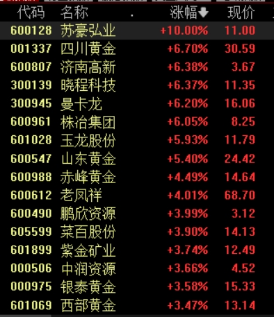 12月4日早盘,黄金板块大幅高开,截至发稿,苏豪弘业涨停,四川黄金、济南高新、曼卡龙等5股涨超6%,玉龙股份、山东黄金等涨幅居前。