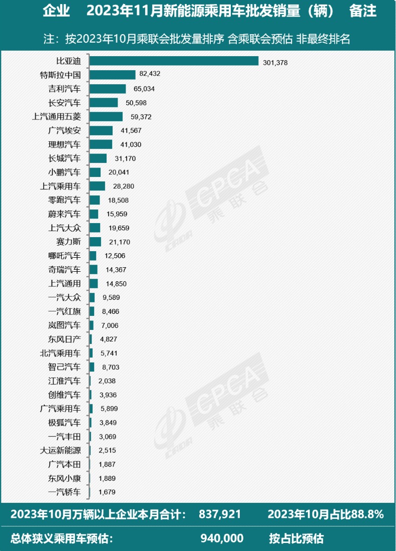 2023年全国新能源乘用车发展优势不断巩固和扩大。乘联会综合预估11月新能源乘用车厂商批发销量94万辆,同比增长29%,环比增长6%。今年1-11月测算的累计批发774万辆,同比增长35%。