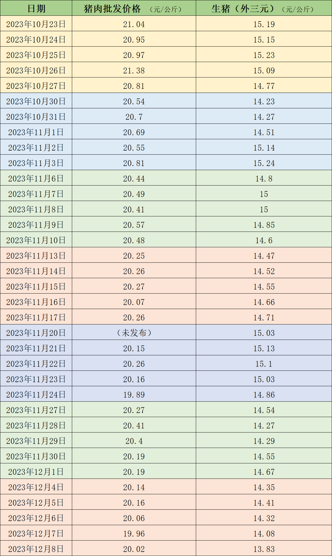 近期的猪肉和生猪价格。 制表澎湃新闻