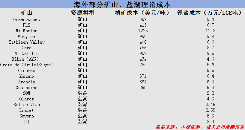 海外盐湖,则有多个项目成本可以达到3万元以下。