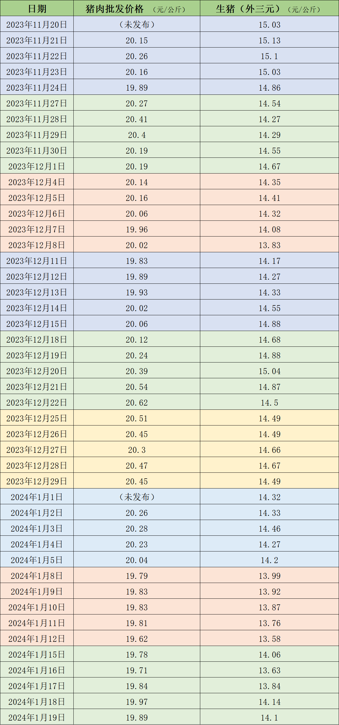 本周生猪周均价上涨。据中国养猪网的数据,1月19日,生猪(外三元)价格为14.1元/公斤,与上周五(1月12日)的13.58元/公斤相比,上涨3.8%。从一周均价来看,本周生猪均价为13.95元/公斤,与上周13.82元/公斤的均价相比,上涨0.9%。