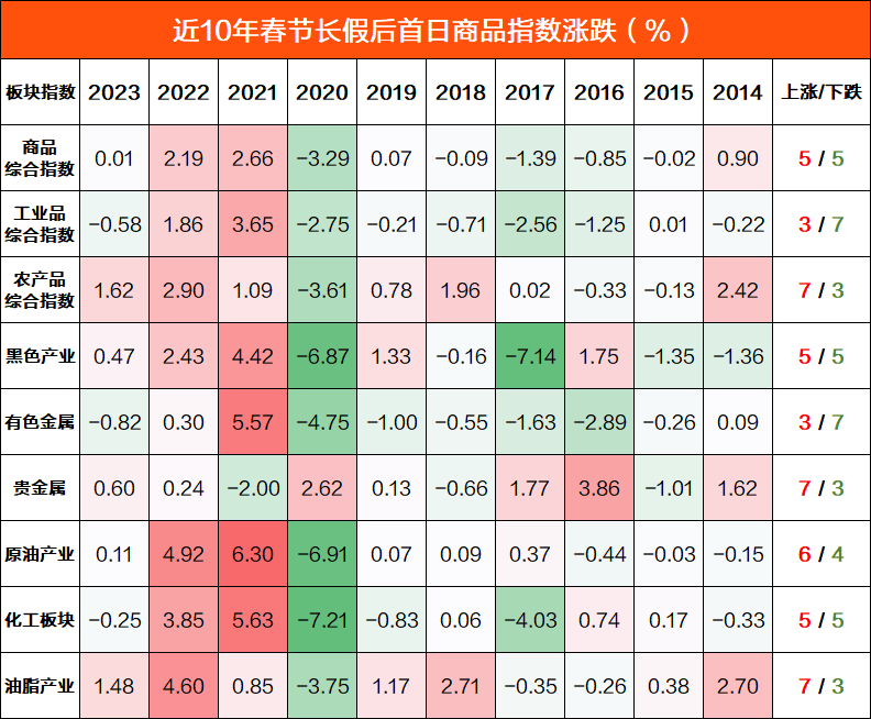 从商品指数涨跌来看,近10年来,商品综合指数节后首日共出现5次上涨,5次下跌。具体板块而言,贵金属和油脂产业节后首日上涨次数并列第一,为7次。行情表现而言,涨跌幅度较大的年份为2020、2021及2022年,整体波动较为剧烈。