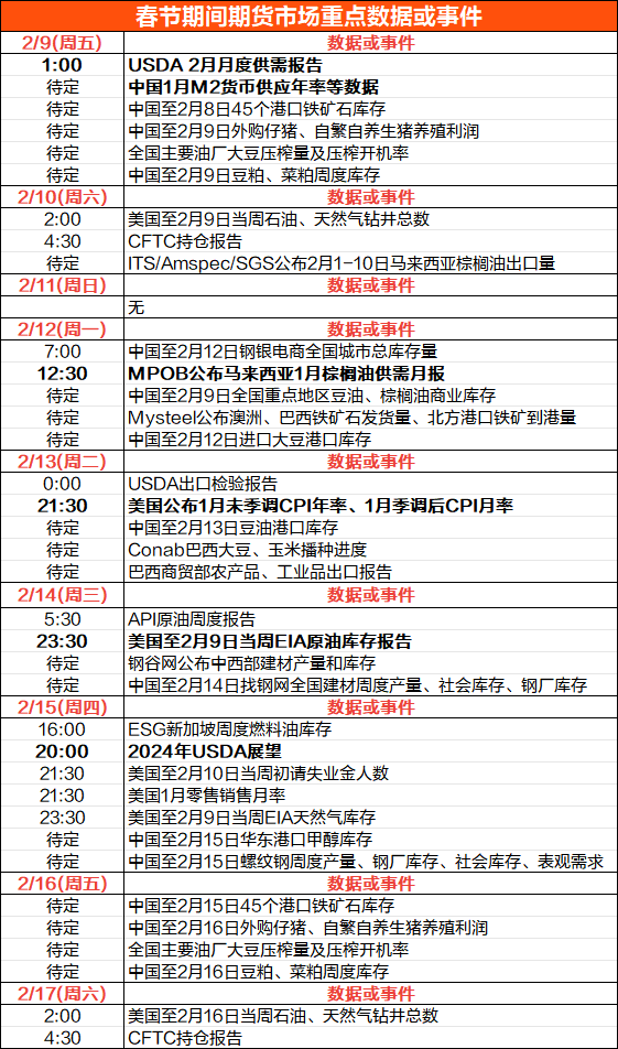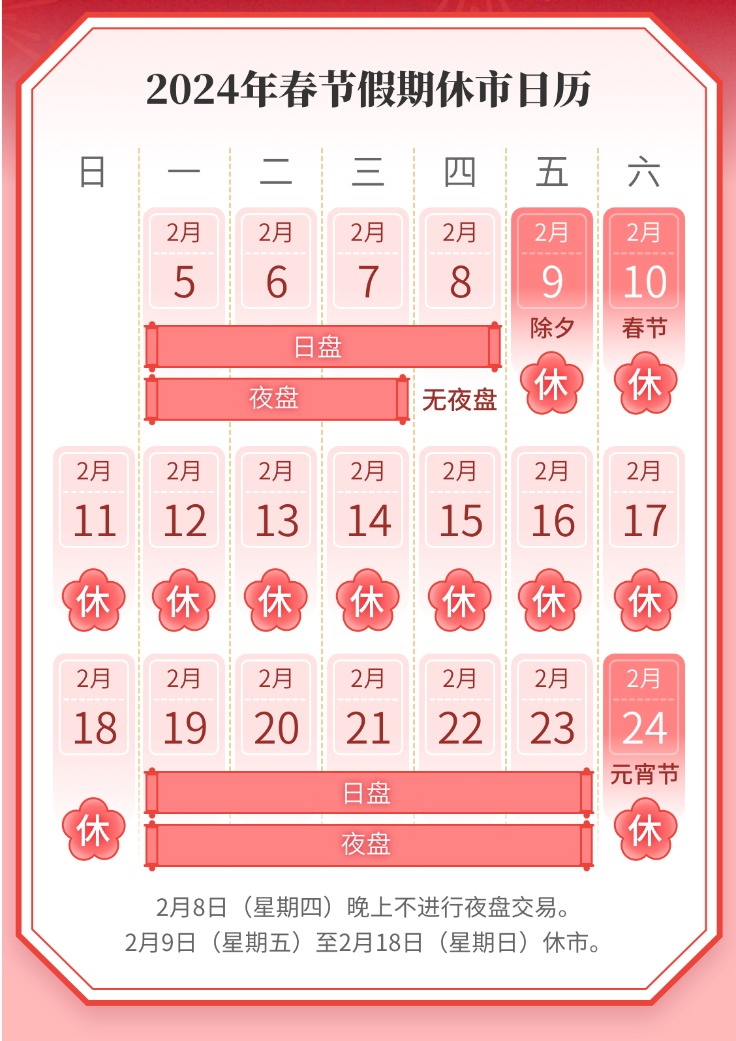 根据交易所通知,2月8日(周四)晚上不进行夜盘交易,2月9日(周五)至2月17日(周六)休市,2月18日(周日)为周末休市,2月19日(周一)起照常开市。