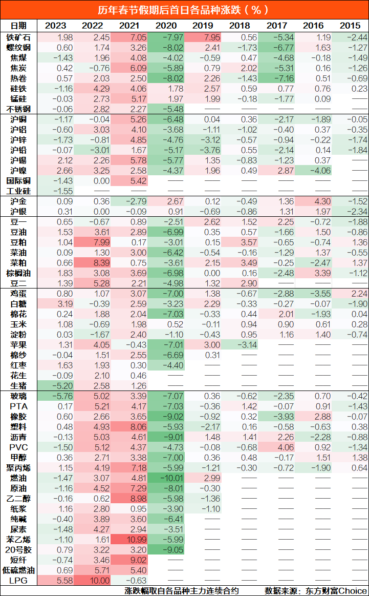 从各品种涨跌来看,大部分品种在2020、2021及2022年节后首日发生了剧烈波动,动辄涨跌幅超过7%。