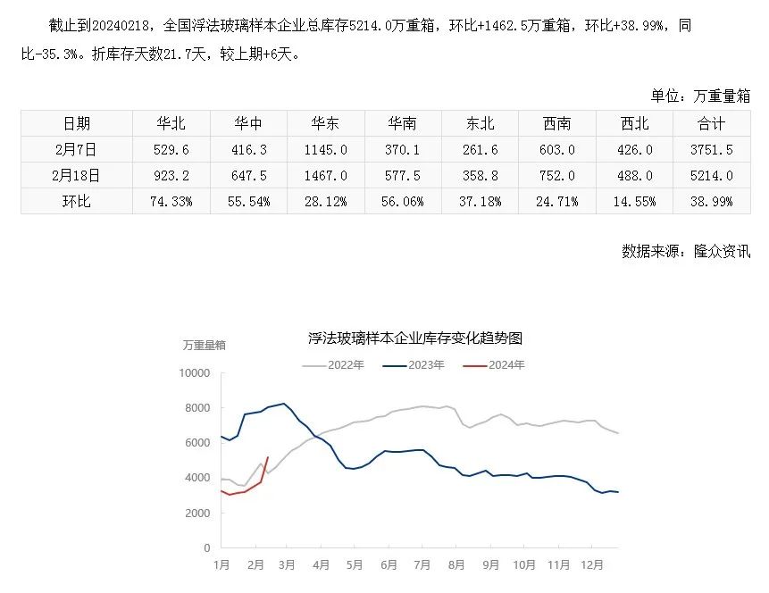 据隆众资讯统计,截至2月18日,全国浮法玻璃样本企业总库存5214.0万重箱,环比增长38.99%,同比下降35.3%。折库存天数21.7天,较上期增加6天。