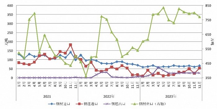 2月28日,冶金工业信息标准研究院(下称研究院)发布的《2023年中国钢铁进出口分析》显示,2023年中国出口钢材9026.4万吨,同比增长36.2%,创2017年以来新高,为历史第四高位;进口钢材765万吨,同比下降27.6%,为1995年有公开数据记录以来首次低于1000万吨。