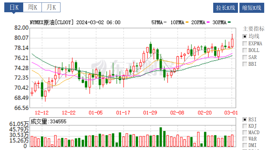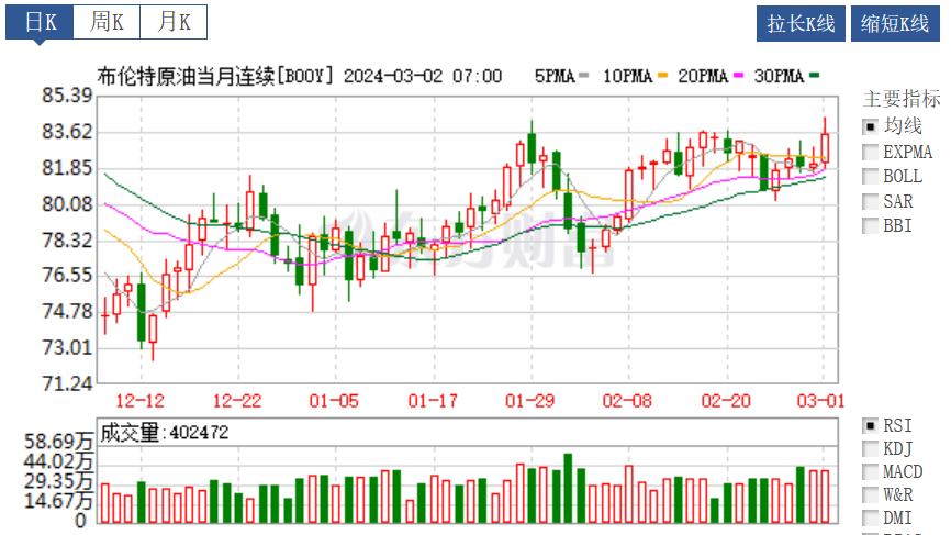 国际油价方面,3月1日,国际原油期货价格在隔夜市场上涨,收盘时国际油价显著走高。截至当天收盘,纽约商品交易所4月交货的轻质原油期货价格收于每桶79.97美元,涨幅为2.19%;5月份交货的布伦特原油期货价格收于每桶83.55美元,涨幅为2%。