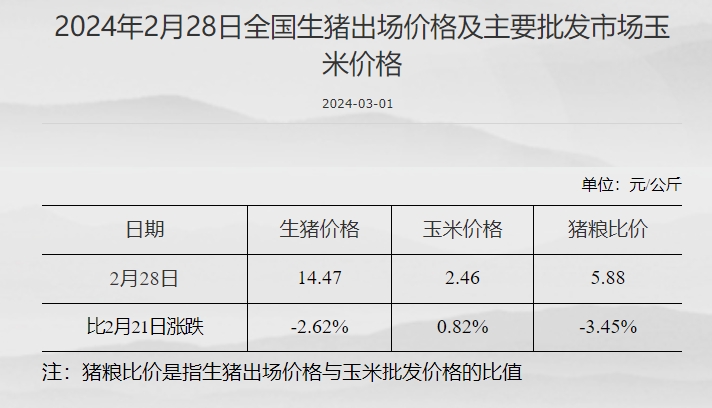 截至2024年2月28日,全国生猪出场价格为14.47元/公斤,比2月21日下跌2.62%;主要批发市场玉米价格为2.46元/公斤,较2月21日上涨0.82%;猪粮比价为5.88,比2月21日下跌3.45%。