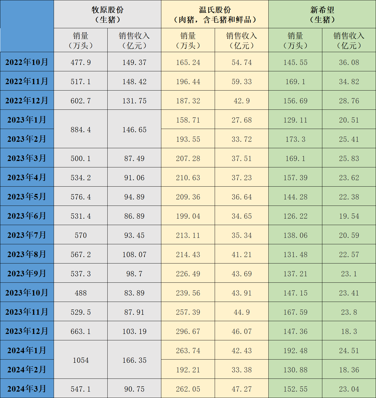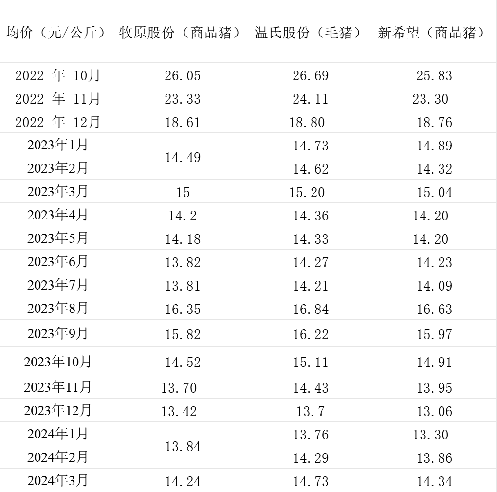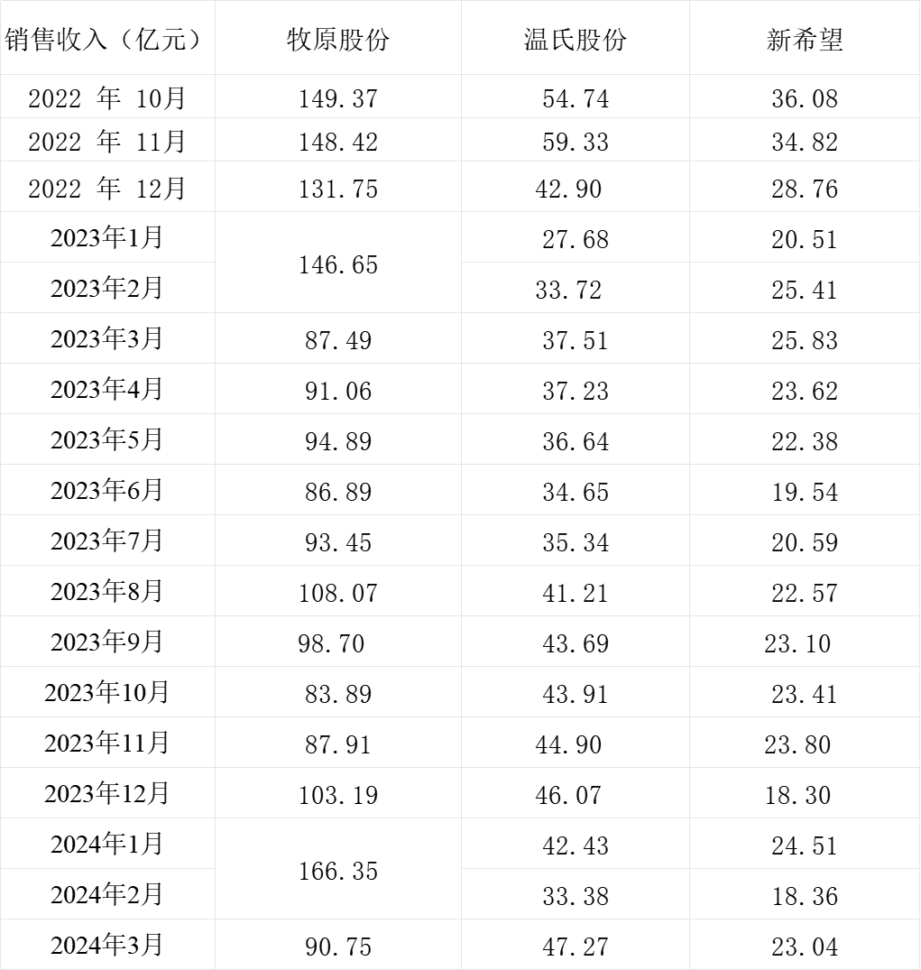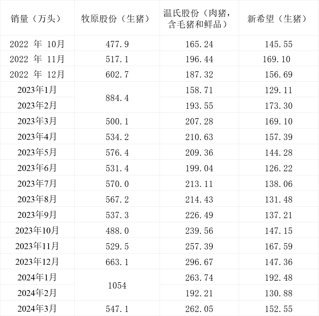 截至4月9日,三大上市猪企牧原股份(002714.SZ)、新希望(000876.SZ)、温氏股份(300498.SZ)全部发布3月生猪销售简报。