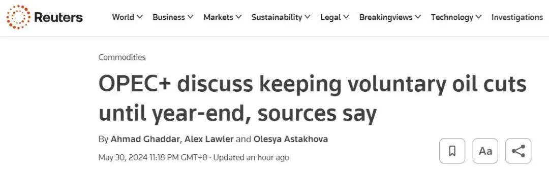 据路透社报道,三位欧佩克+消息人士表示,目前自愿减产220万桶/日的成员国正在讨论将减产协议延长至今年年底。两位欧佩克+消息人士表示,另一种选择是将自愿减产协议延长至今年第三季度。另外两位消息人士表示,如果欧佩克+发现原油需求上升,他们不排除进一步减产,也不排除将更多石油储备投放市场。