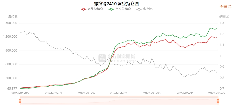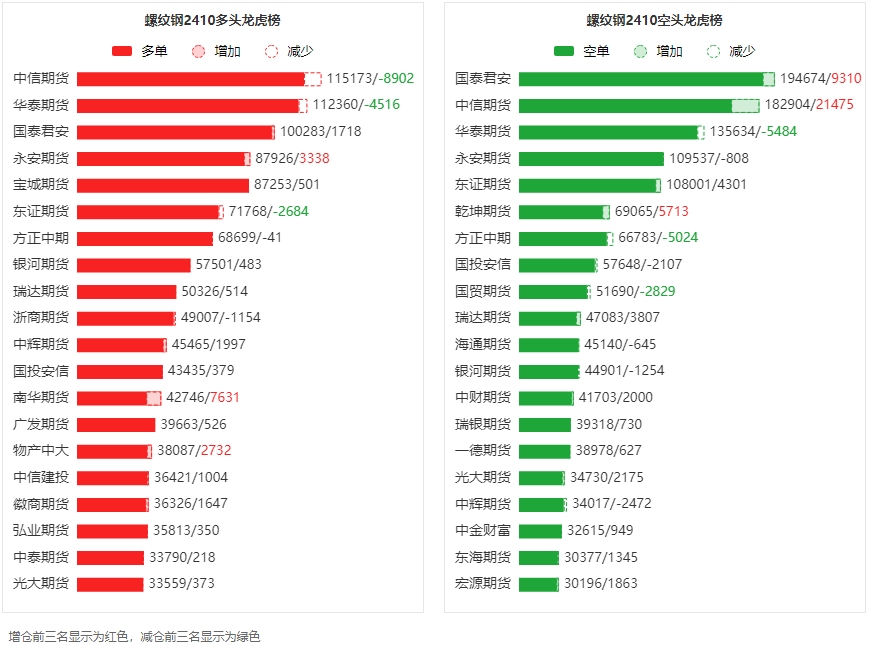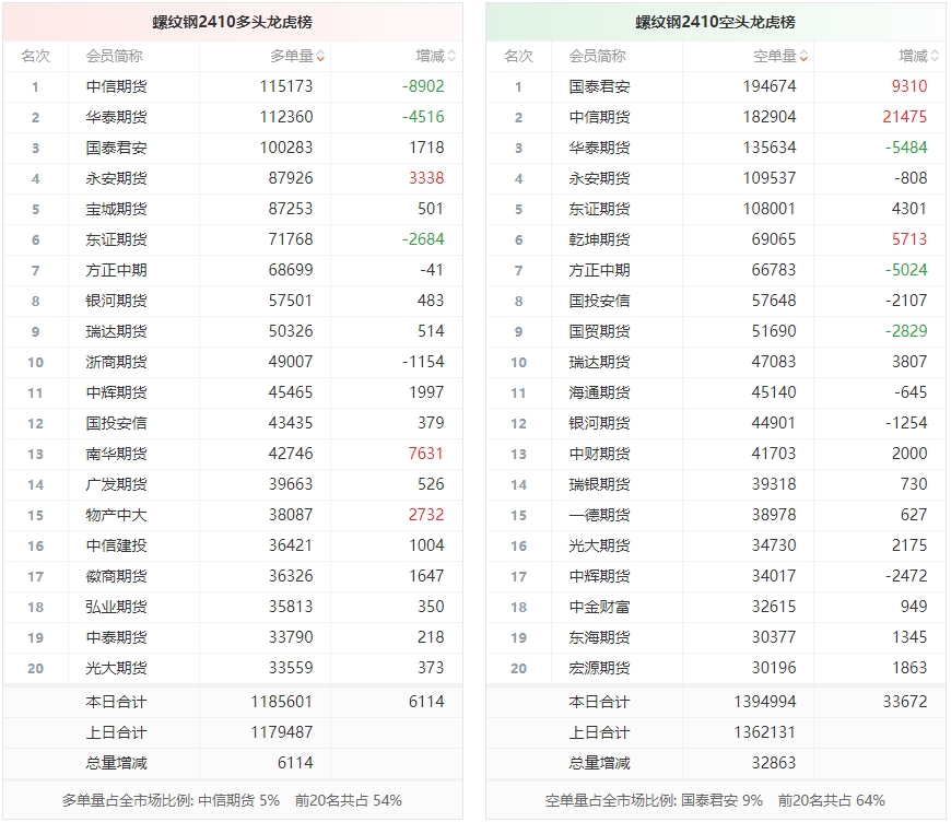 总体而言,螺纹钢2410合约今日增仓下行,多空持仓排名前20席中,多空双方均呈进场态势,多头进场意愿弱于空头。