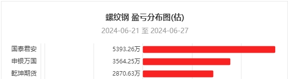 数据显示,一周内国泰君安、申银万国、乾坤期货在螺纹钢上盈利居前,三机构分别盈利5393.26万元,3564.25万元,2870.63万元。